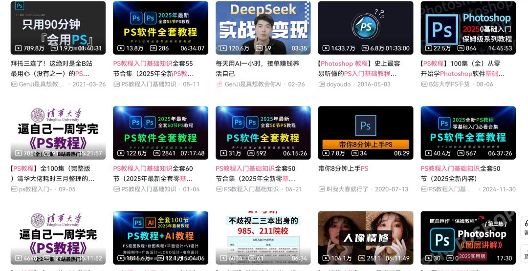 在这上面可以学到很多,不仅是PS技能,包括其他赛道的也一样可以学习,比如:学素描、办公技能、学外语、学手工等等,都可以在上面去搜,各种技能学习上面都有,可以找到一些免费的教程。