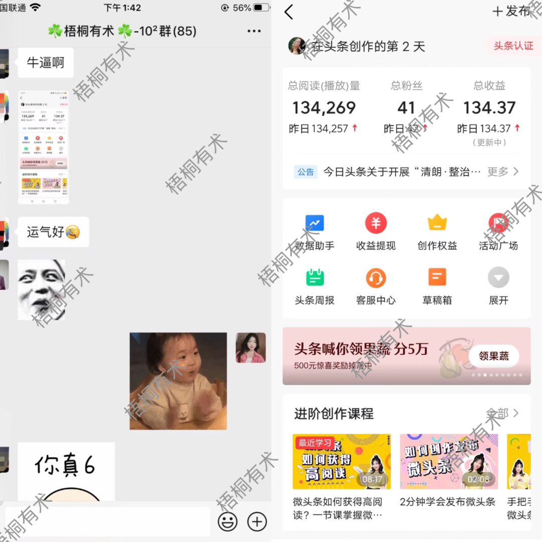 这位群里的小伙伴新号第二天就收益134,在没来社群之前,他都不知道头条还能拿来挣钱,当你进入了一个搞钱的圈子,愿意去学下手去做,还担心赚不到钱吗?